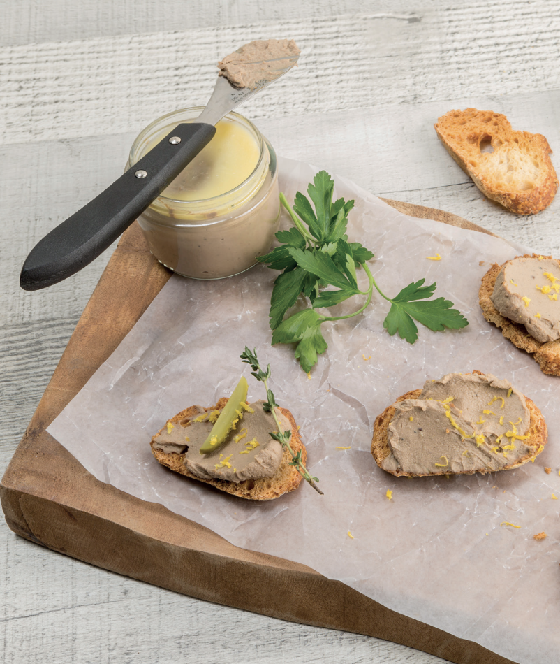 - Acompanya el paté amb unes torradetes de pa, pell de cítric ratllat i uns cogombrets en vinagre.